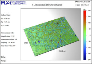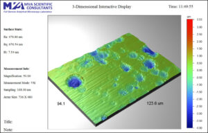 In addition to the interferometry method, MVA Scientific Consultants also has two scanning electron microscopes (SEM) that can provide high resolution surface imaging. SEM is a very powerful technique for surface analysis. It is a non-destructive technique and provides extremely high magnification. It can achieve a lateral resolution in the nanometer range. When coupled to an energy dispersive x-ray (EDS) system, the SEM can also obtain surface elemental composition of a sample.