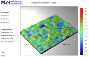 Scanning white light interference microscopy (SWLIM) is a non-contact optical profilometry technique used to obtain three-dimensional images and quantitative measurement of surface texture or “roughness.” The technique requires minimal sample preparation, is non-destructive, extremely fast, and able to analyze a variety of sample types. Sampling of large areas is possible with the motorized and automated sample stage. Measurements include surface shape, surface finish, surface profile roughness (Ra), surface texture, and structural characterization.