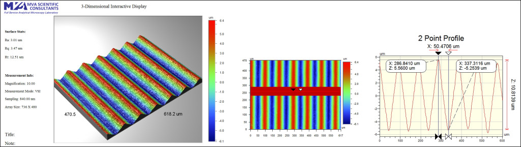 Surface analysis by white light interferometry is well-suited to address numerous applications. Common sample types include moldings, automobile parts, electronics, leathers, papers, failed components, medical devices and solar panels. Accommodating many sample geometries, our surface topography characterization lab offers an array of possible dimension analyses and a versatile Z-range.